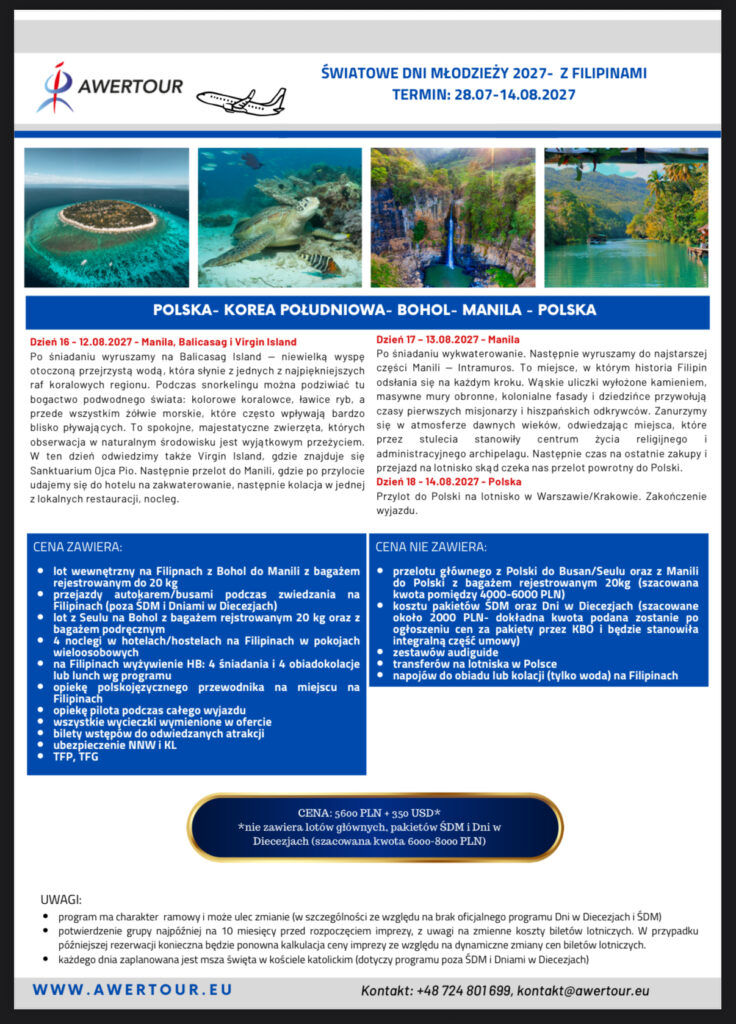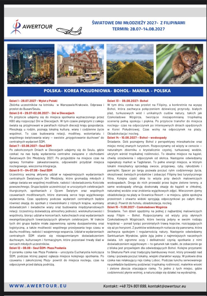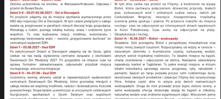 Aktualności | 20 lutego 2026 Halo! Halo! Tu Korea!Zapraszamy na wyjazd na Światowe Dni Młodzieży do Korei Południowej z ks. Bartoszem, jest on połączony ze zwiedzaniem Filipin. Serdecznie zapraszamy młodzież! Screenshot